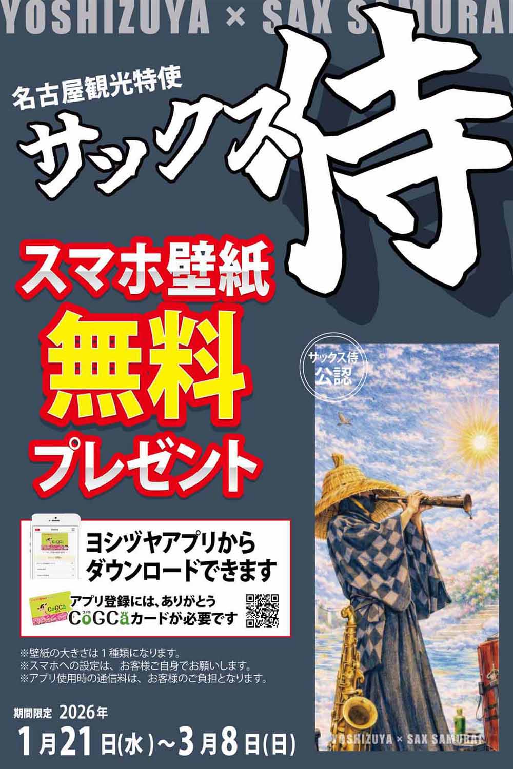 サックス侍 オリジナル「スマホ壁紙」プレゼント 2026-01-20 津島本店 津島北テラス 新稲沢店 JR蟹江駅前店 Yストア蟹江食品舘 弥富店 甚目寺店 師勝店 佐屋店 Yストア唐臼店 Yストア佐古木店 大口店 平和店 清洲店 名古屋名西店 太平通り店 愛西勝幡店 豊山テラス 犬山店 Yストア津島駅東店 Yストア守山大屋敷テラス Yストア篠田店 Yストア笹塚食品館 Yストア笠松店 Yストア西春店 海津平田店 可児店 スーパー・センター垂井 員弁店
