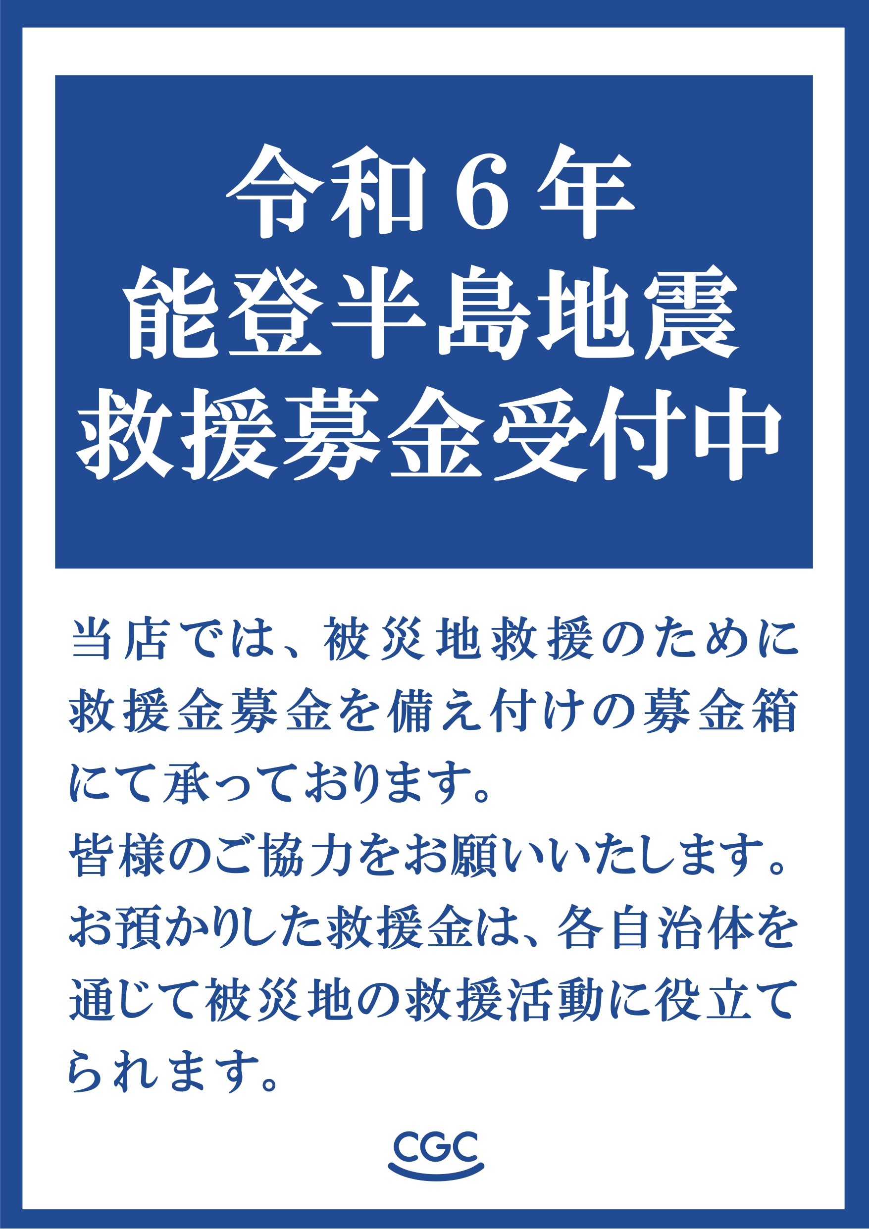 《令和6年能登半島地震救援募金》 皆様のご協力をお願い申し上げます 2024-01-04 ヨシヅヤ・Yストアでは、令和6年能登半島地震救援募金を 1月5日(金)から1月31日(水)まで実施いたしております。 募金箱は、お客様センターに備えつけております。 お預かりした救援金は、CGCグループを通じ救援活動に役立たれます。 皆様のご協力をお願い申し上げます。